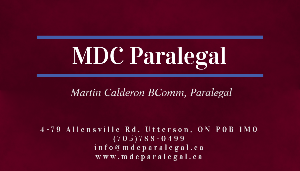 Welcome to MDC Paralegal. I am a licensed Paralegal serving the Muskoka Region. I am passionate about the law and approach my cases with that passion. All initial consultations are free and I look forward to our conversation.